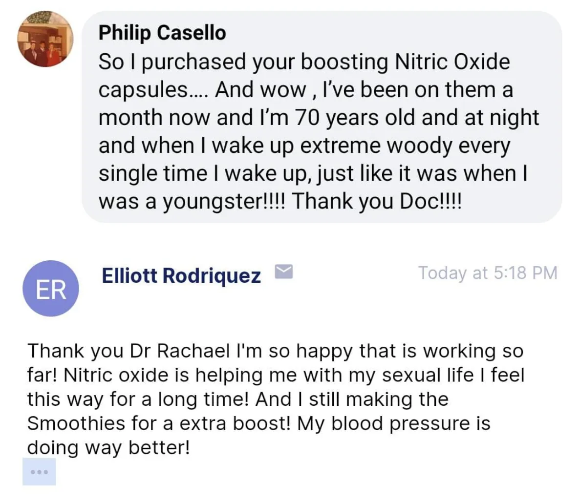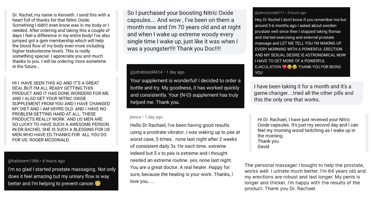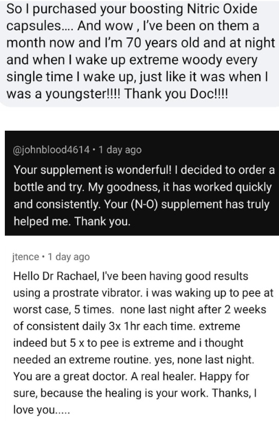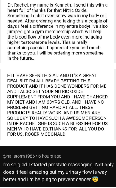 Hello Dr. Rachael, I am very happy with everything you are showing and saying. I do the smoothies every day, regular daily pumping, take your Nitric Oxide and all is good, follow all. My previous already good size penis became a super whale, I love it and my wife loves it.